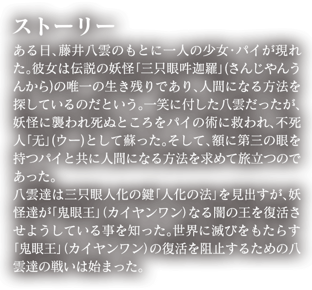 ある日、藤井八雲のもとに一人の少女・パイが現れた。彼女は伝説の妖怪「三只眼吽迦羅」の唯一の生き残りであり、人間になる方法を探しているのだという。一笑に付した八雲だったが、妖怪に襲われ死ぬところをパイの術に救われ、不死人「无」として蘇った。そして、額に第三の眼を持つパイと共に人間になる方法を求めて旅立つのであった。八雲達は三只眼人化の鍵「人化の法」を見出すが、妖怪達が「鬼眼王」なる闇の王を復活させようとしている事を知った。世界に滅びをもたらす「鬼眼王」の復活を阻止するための八雲の戦いは始まった。